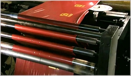 С помощью дозатора краситель поступает к специальным красящим валикам, которые и производят печать рисунка. После нанесения печати, пленку снова сматывают в рулоны.